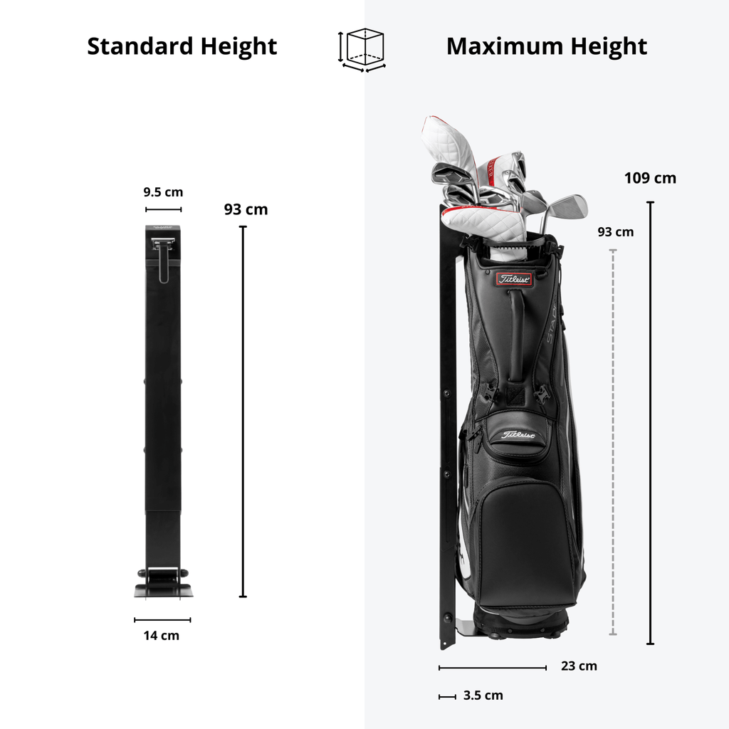 Your golfbag is a piece of art and should not be stowed away in the back of your car or the corner of your garage. Keep it high, dry whilst saving space with our premium steel wall mount. Elevate your golfbag to a place of honor with our premium steel wall mount, showcasing it as the work of art it truly is.